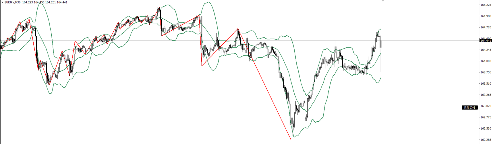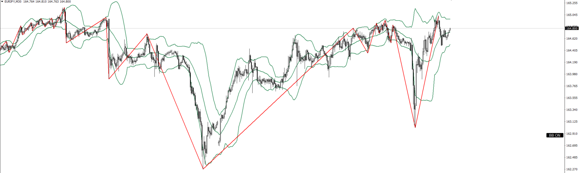 ・週足は上目線Aなので、4h下に転換で売り⇒4hは上目線で、ふくじでは下目線、30mが上目線に転換したので、買い。4hもBまで来ているので30m転換までステイ