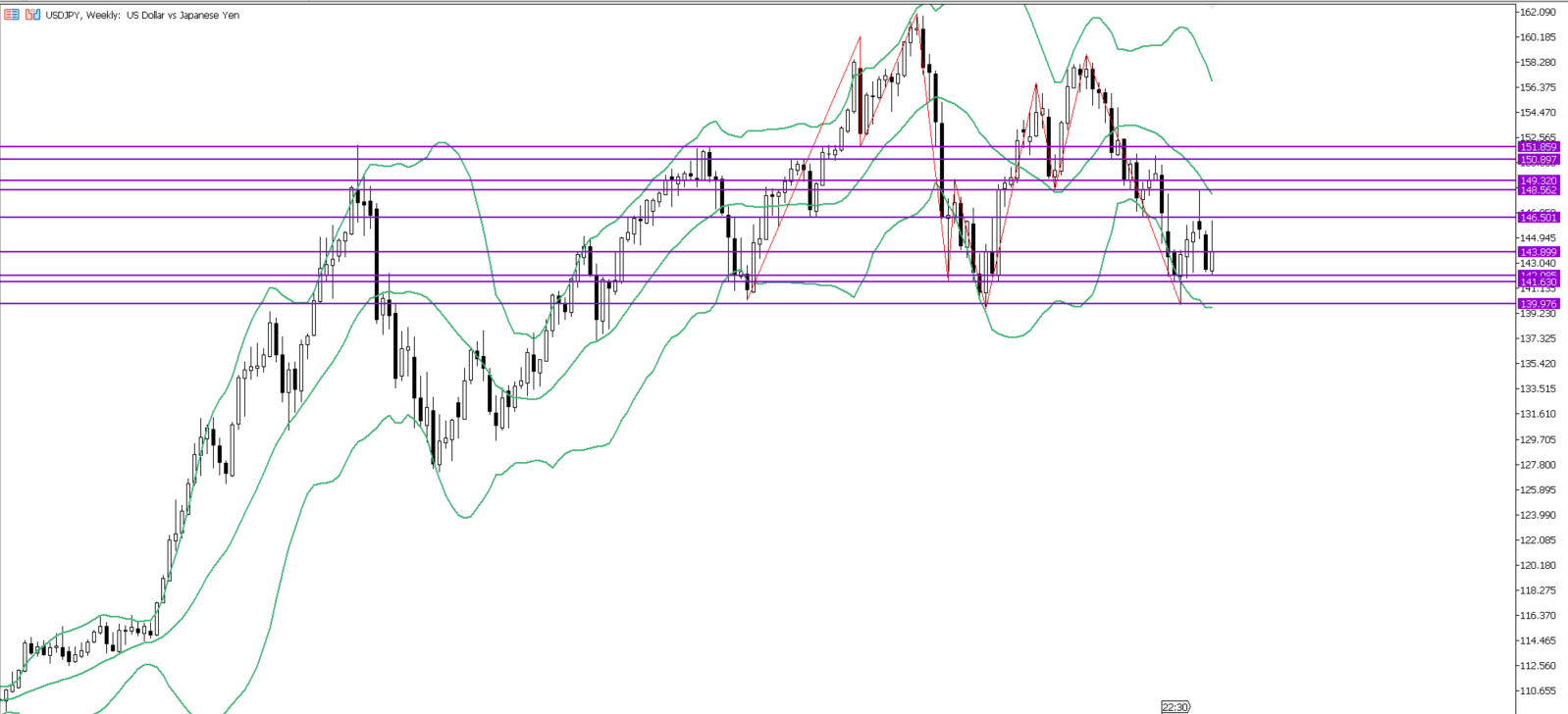 週足は下目線Bで、ネックラインに当たって上がった→もう一度ミドル付近まで買い