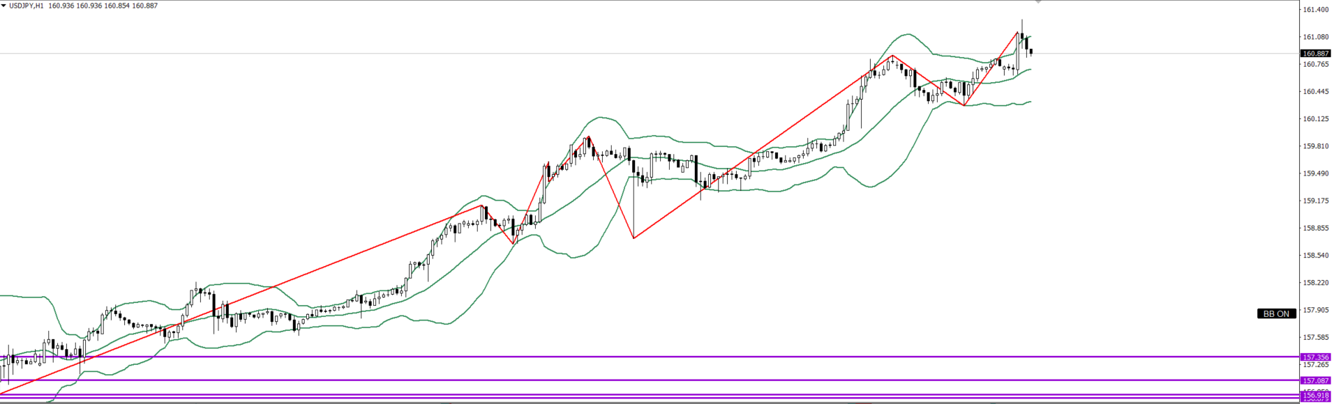 4hは下目線だが、30mが上目線に転換したので逆張りで157.388付近まで買い
