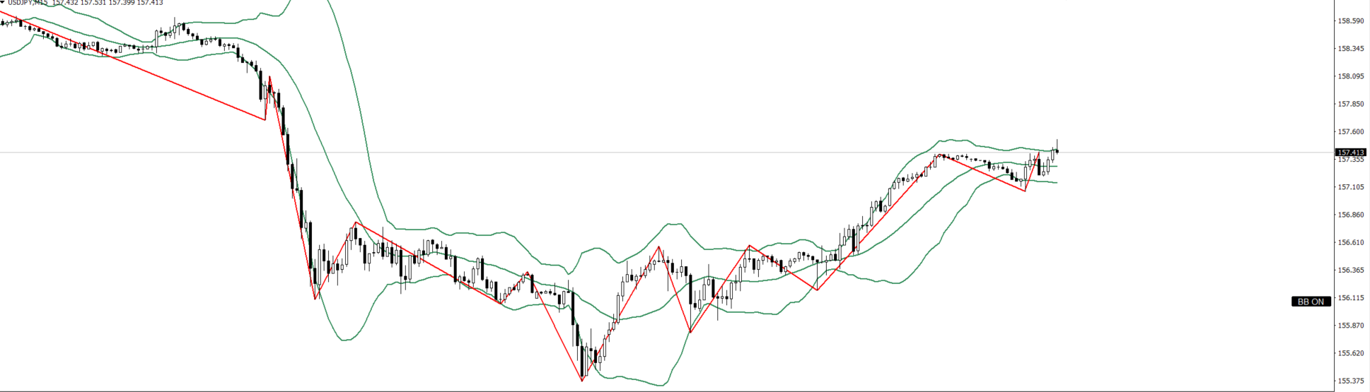 4hは下目線だが、30mが上目線に転換したので逆張りで157.388付近まで買い